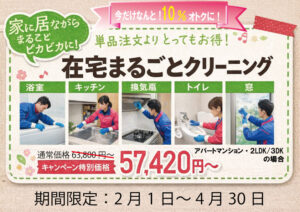 o○.。+o●.。+o○.。+o●.。+o○ ┏━┓┏━┓┏━┓┏━┓┏━┓ ┃新┃┃生┃┃活┃┃応┃┃援┃ ┗━┛┗━┛┗━┛┗━┛┗━┛ ┏━┓┏━┓┏━┓┏━┓┏━┓┏━┓ ┃キ┃┃ャ┃┃ン┃┃ペ┃┃ー┃┃ン┃ ┗━┛┗━┛┗━┛┗━┛┗━┛┗━┛ o○.。+o●.。+o○.。+o●.。+o○ お家まるごとキレイで気分一新! 新生活のスタートはプロの徹底清掃で —————————————————- お引越し前・後 まるごとクリーニング アパート・マンション【2LDK/3DK】 浴室/キッチン/換気扇 /トイレ/窓ガラス 全部コミコミ! 税込 43,560円~ —————————————————- 在宅 まるごとクリーニング アパート・マンション【2LDK/3DK】 浴室/キッチン/換気扇 /トイレ/窓ガラス 全部コミコミ! 税込 57,420円~ —————————————————- キャンペーン期間 2026年4月30日まで 新生活・お引越しシーズン限定 この機会にぜひご利用ください —————————————————-